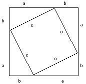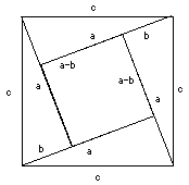 The same result can also be shown using a different square, of area c2. As the drawing on the right shows, that area can be divided into 4 triangles like the ones before, plus a small square of side (a-b). We get c2 = (4)(1/2)(a)(b) + (a-b) 2 = 2ab + (a2 - 2ab + b2) = a2 + b2 Q.E.D. Q.E.D. stands for "quod erat demonstrandum," Latin for "which was to be demonstrated," and in traditional geometry books those letters mark the end of a proof. The importance of the work of Pythagoras and of later masters of Greek geometry (especially Euclid) was not only in what they proved, but of the method they developed: start from some basic statements which are assumed to be valid ("axioms") and deduce by logic their more complicated consequences ("theorems"). Mathematics still follows the same pattern. |