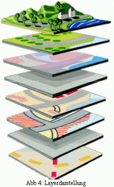 Im GIS werden die Objekte in thematischen Karten (Layern) verwaltet, die nach Bedarf miteinander kombiniert werden können. Die thematischen Karten kann man sich als Folien vorstellen, die je nach Thema entweder Straßen oder Gewässer enthalten. Durch Überlagern der verschiedenen Folien am Bildschirm kann man dann Zusammenhänge feststellen.