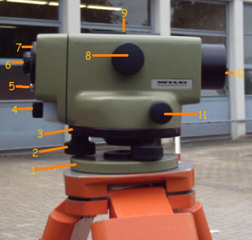 Angle fairs: | The magnifying glass (4) for reading the horizontal circle is below the telescope eyepiece. An interval corresponds to 1 gon. Normally, one estimates on 1/10 of a degree. One can adjust and the horizontal circle manually, using at the horizontal screw for turning the horizontal circle (3) to any initial reading. For measuring one directs the vertical line in the telescope picture to the first goal or toward the centre of the levelling rod, and reads the horizontal circle (or sets it to zero). From here aim at the further points which can be measured, and read each bearing on the horizontal circle. |
