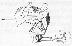 Compensation of the Wild NAK1 The pendulum consists (as shown in the diagramm) of four linked tensiered bands in acrossed form and carries a deviating prism, which is the mobile optical part of the compensator. The "beam" of the laws is magnified by with a factor of 10 by the drawing prism. By pushing the controllbutton (shown on the right in the picture) the free swing of the pendelum can be checked. |