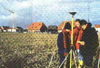 Ein Messtrupp des Katasteramtes Stade und eine Auszubildende bei einer Liegenschaftsvermessung mit GPS. |